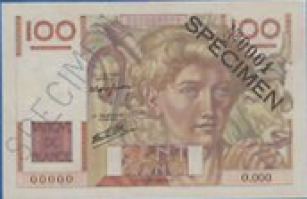 Dommage pour la qualité de l'image, mais il s'agit bien du spécimen numéroté 001 pour le 100F Jeune Paysan.(vente W.A.C)