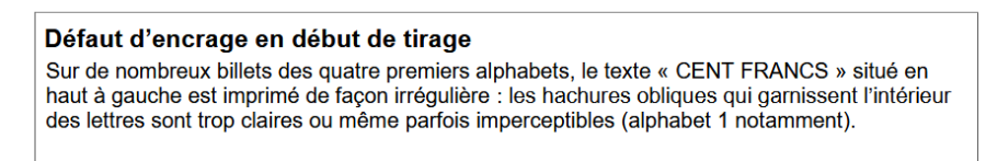 Gageons qu'un jour les collectionneurs passeront outre cette distinction., de la même manière que les "3 tailles" de filigrane ont déjà été réduites à 2...(pour ma part, je pense que le défaut du filigrane résultant d'un étirement du papier a également été progressif, comme les hâchures du "CENT FRANCS"