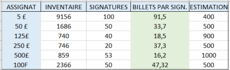 Dans le tableau ci-dessous, dans "inventaire", le nombre d'assignats répertorié pour chaque type dans les mêmes conditions.