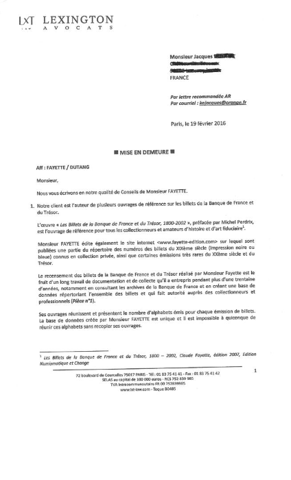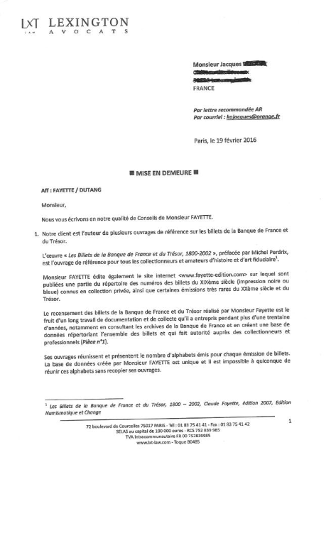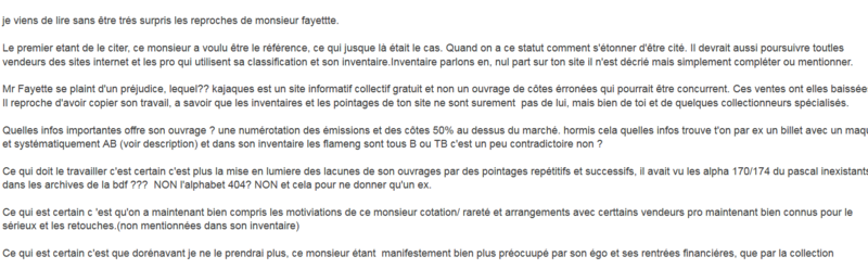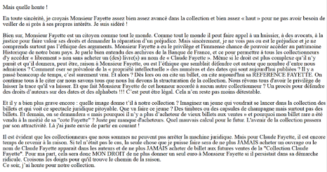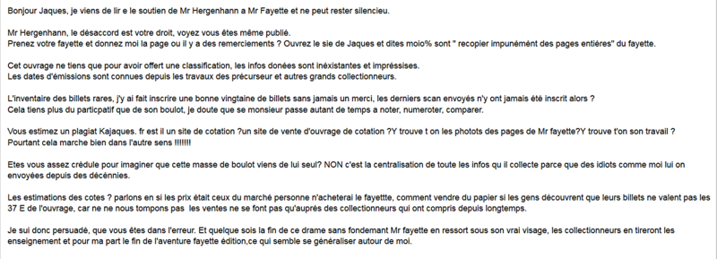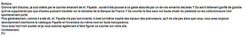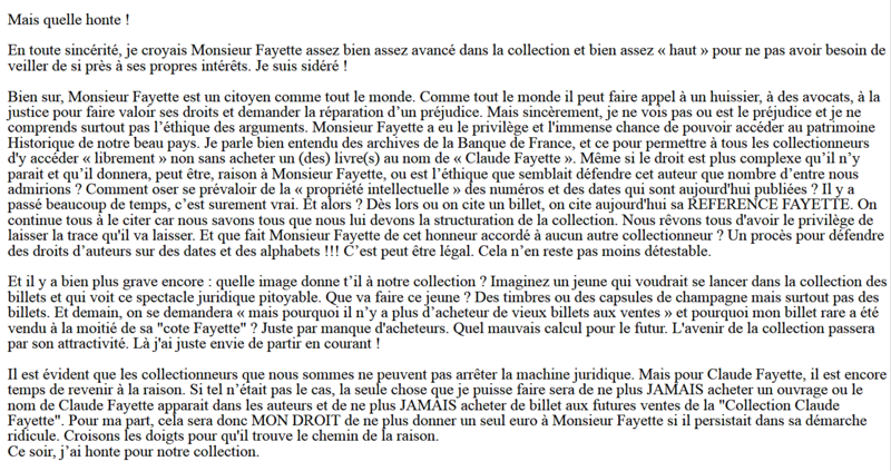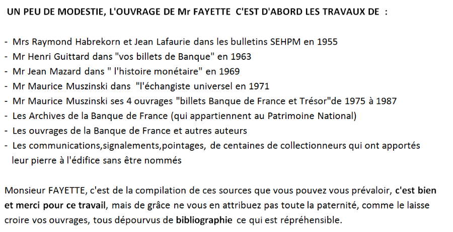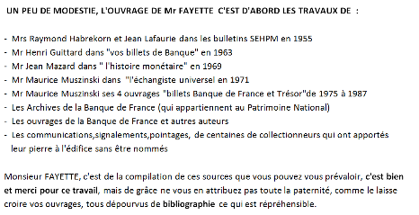 Je suis accusé d'avoir plagié le livre de C.Fayette, notamment en ce qui concerne le rapport entre les dates des billets et les alphabets concernés, relation qu'il n'aurait établie que grâce à ses entrées aux archives de la Banque de France.