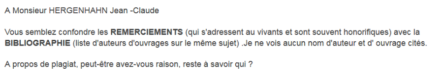 La réponse ne s'est pas fait attendre. Le 25 janvier, il me téléphone en m'accusant de plagier ses livres. Dans un souci d'apaisement, je lui ai fait la promesse ce jour-là de modifier certains chapitres de mon site.