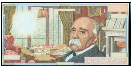 Le nom de Georges Clemenceau est inscrit dans un cartouche marron sur sa veste au recto.