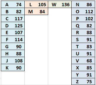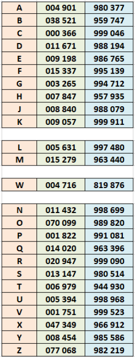 Les plus petits et les plus grands numéros retrouvés pour chaque lettre.