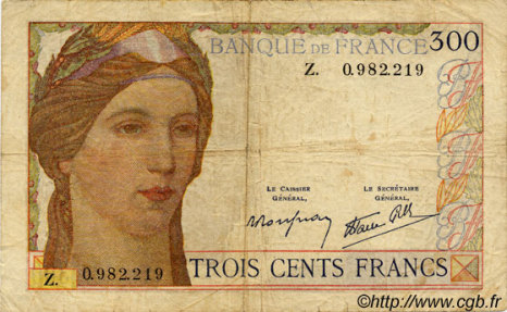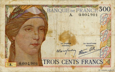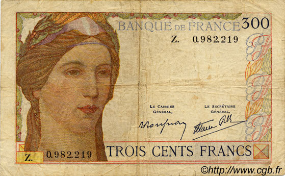 Appellation Banque de France : 300 francs BDF type 1938 "Cérès" BDF 193802