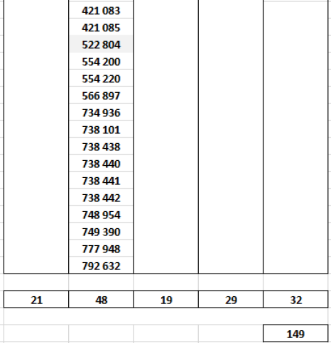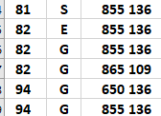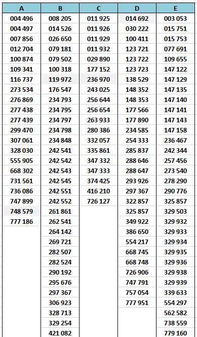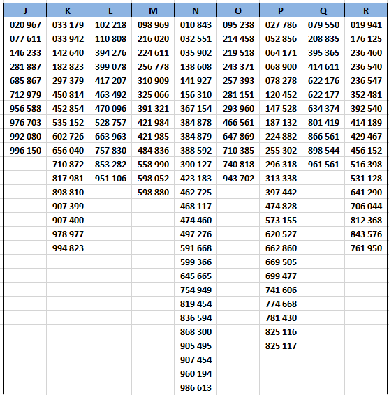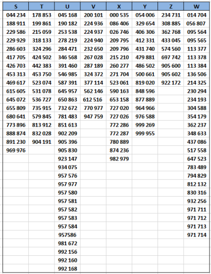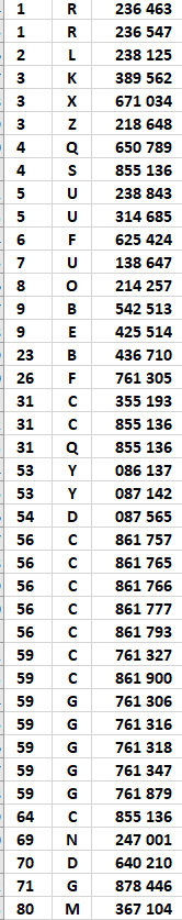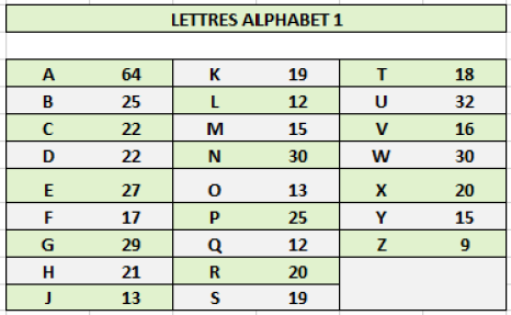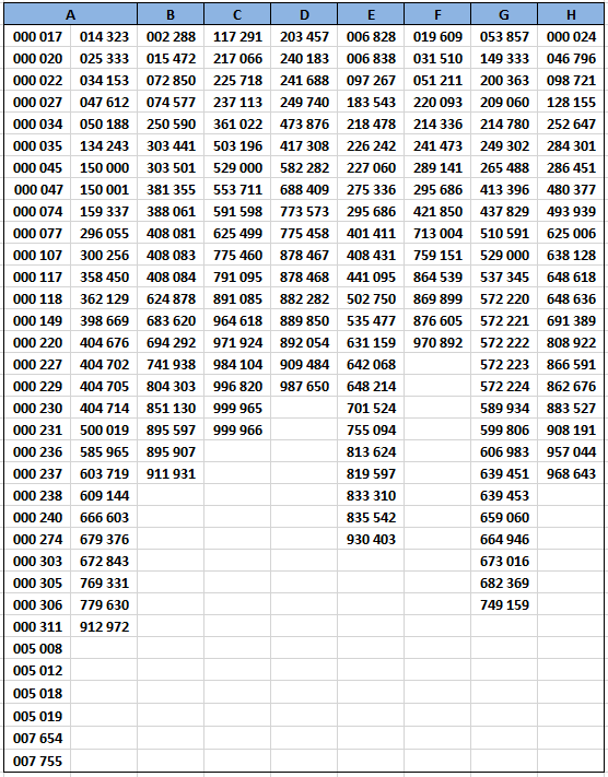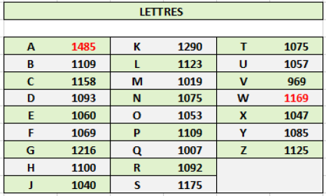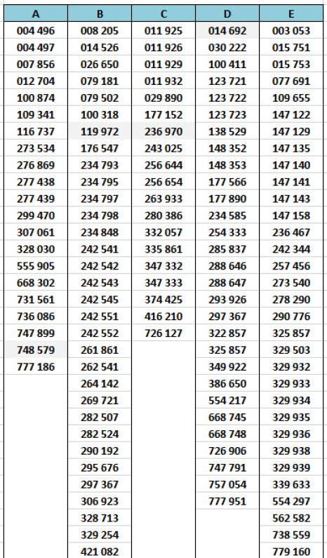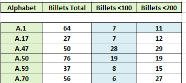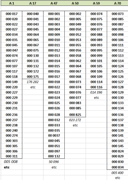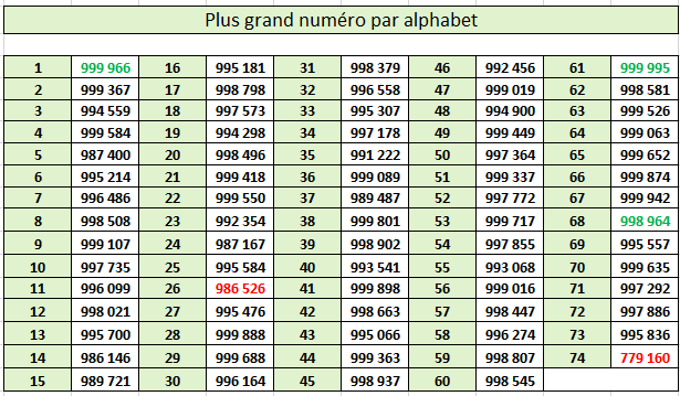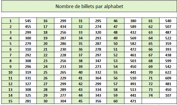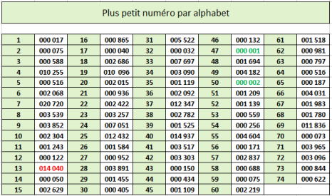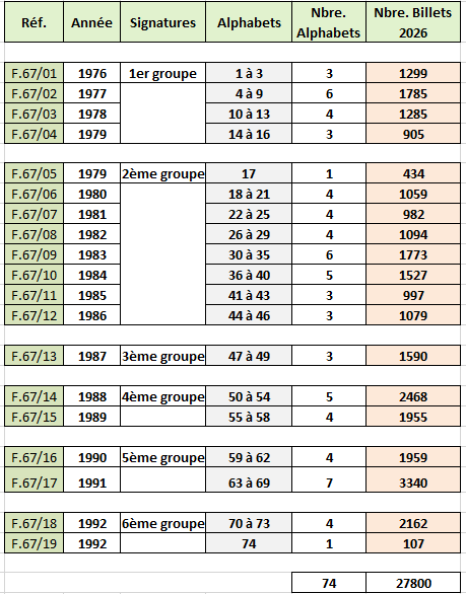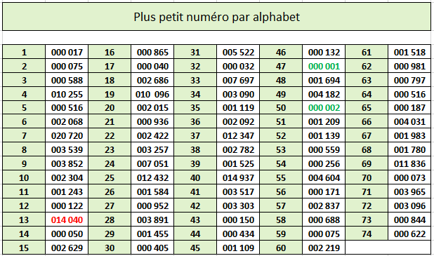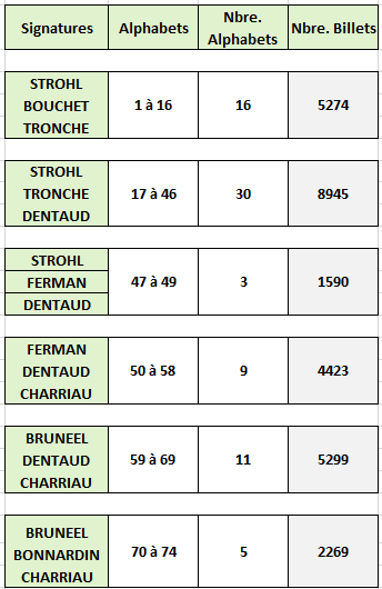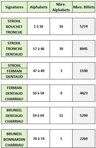 Dans le tableau ci-dessous, on note pour chacun des alphabets concernés une rupture très nette entre le dernier numéro en carctères gras et le suivant retouvé, en caractères maigres. C'est là que devrait se situer un changement de cote réaliste (les 1000 premiers billets?)