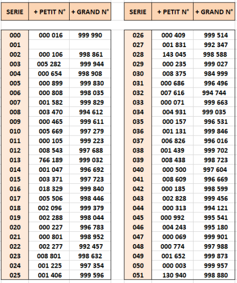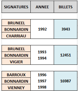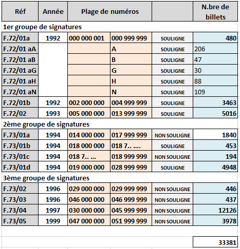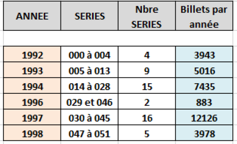 La numérotation de ces "billets" s'inscrit dans la numérotation logique des billets mis en circulation régulièrement par la BDF, à l'exception des suivants: