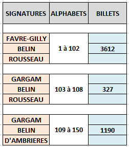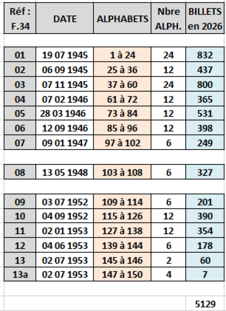 Tableau réalisé à partir des différent ouvrages de J.M. DESSAL, C. Fayette et M. Muszynski entre 1975 et 2019, pour un billet en état TTB.