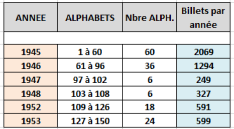 Dans mon pointage, 245 billets relevés pour le n°6 (alphabets 85 à 96) et 245 pour le n°8 (alphabets 103 à 108), chiffres en contradiction totale avec la cote pour ces deux dates.