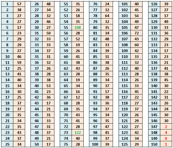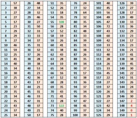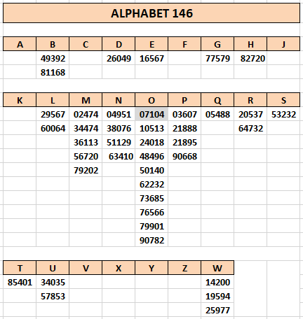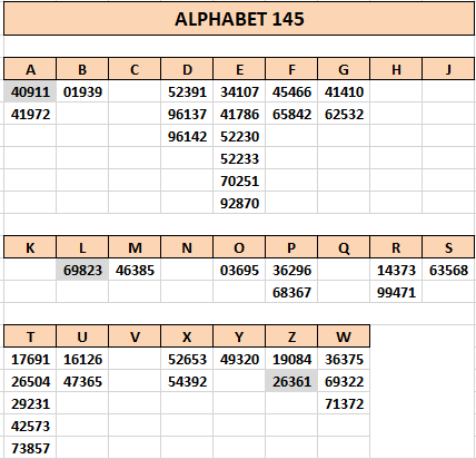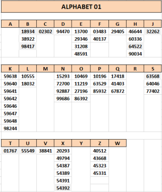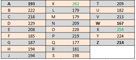 Les tableaux précédents montrent une anomalie (en vert) pour les lettres K et X et pour les alphabets 55 et 73