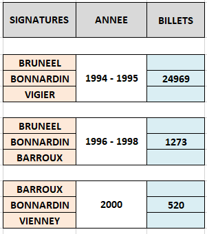 - Type 1993 modifié 1996 ( BDF 199601) : impression sur presse continue à un billet de front à partir de 1996.