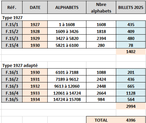 - type 1927 "A quatre couleurs" Luc-Olivier Merson adapté 1930 BDF 193003: ajout d'une 2ème lettre dans la date de création (alphabet 5845)