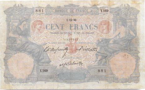 100F type 1892 "réserve". Répertorié en 2002 par C.F. sous la référence A.51